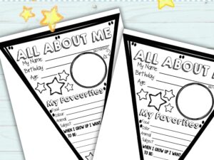 Our all about me printable comes in 2 versions, US and UK English. This activity also comes in color, so you have the option of printing the colored version, or you can have your students/children color it in.